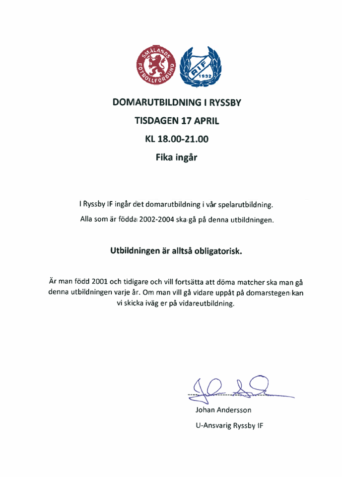 För att bedriva våran ungdomsverksamhet behöver vi föreningsdomare som kan döma våra ungdomsmatcher. Vi kör en utbildning den 17 april i klubbstugan i Ryssby. Ryssby IF 4 apr 2018 0kommentarer